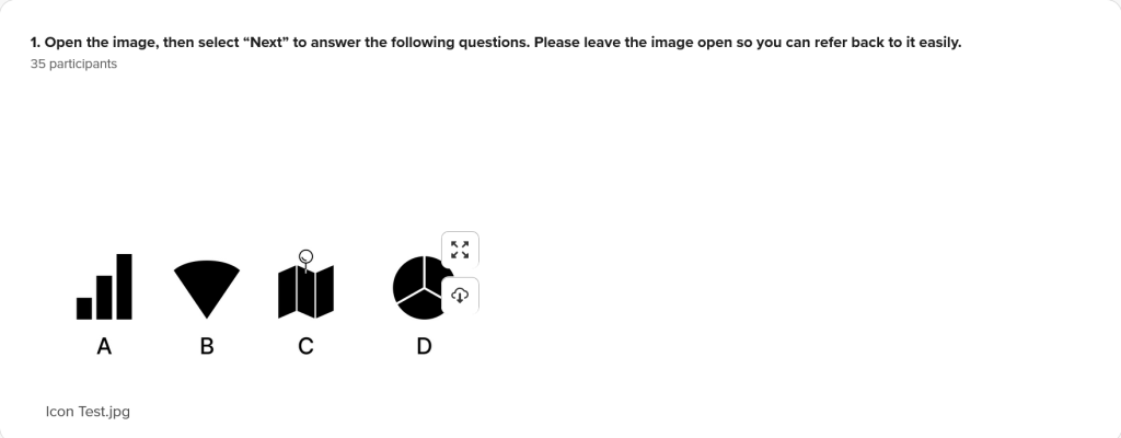 I felt it was necessary to follow with a new survey that showed the different sizes offered by the network. I wanted to see if it was more clear to testers if they could see the different states of these icons. I also went ahead and removed the pin from icon D, because there was some confusion there in the previous test.